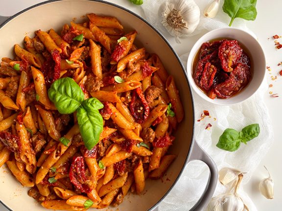 Try our Italian Sausage & Sundried Tomato Pasta with Red Barn Smokehouse Italian Sausage, Parmesan Cheese, and Fresh Basil! Recipe by local food blogger Melissa of Season & Serve Recipe Blog based here in Victoria, BC.